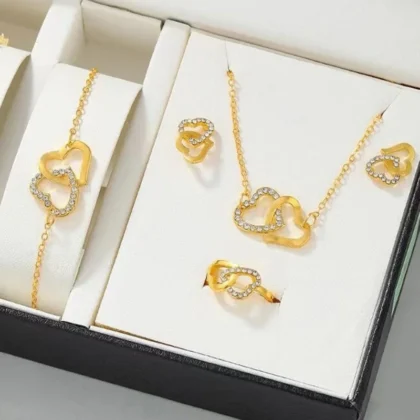 5Pcs Set Gold-Color Heart Shaped Jewelry Sets of Ring Earrings Necklace for Women Elegance Rhinestone Double Heart Jewelry